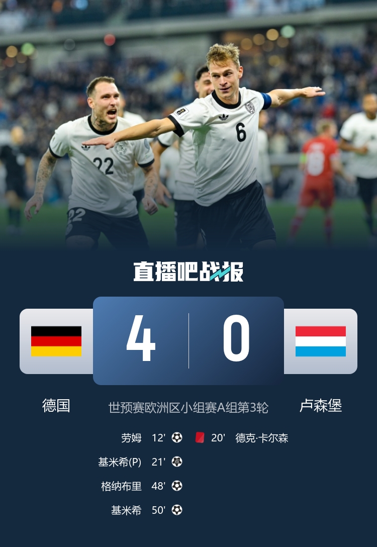 在东欧的夜空下,德国国家队在世预赛欧洲区的小组赛中以4-0的绝对优势战胜了卢森堡,展现了他们强劲的竞争力。这场比赛于北京时间10月11日凌晨2:45在伊杜纳信号公园球场进行。上半场,虽然德国的沃尔特马德一度进球却因手球被判无效,但随后劳姆的精彩任意球打破了僵局,将比分改写为1-0。紧接着,卢森堡防守球员卡尔森在禁区内故意手球被出示红牌罚下,德国获得了点球机会,基米希稳稳将球罚入,半场结束时,德国以2-0领先。