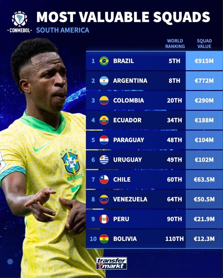 南美国家队球员身价排行榜 巴西以9.15亿欧元领跑 阿根廷紧随其后以7.72亿欧元位居第二_足球直播在线直播观看免费