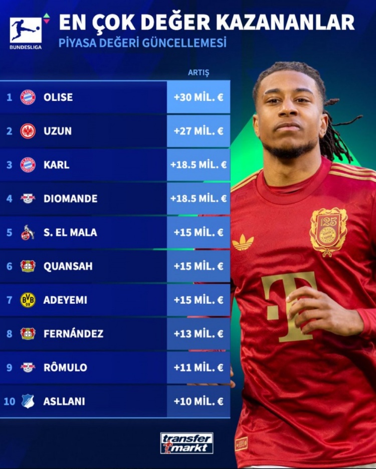 首先,奥利塞来自拜仁,以3000万欧元的涨幅位居榜首,确实显示了他的出色表现和潜力。其次,乌尊的成长速度也让人刮目相看,2700万欧元的上涨证明了他在法兰克福的卓越贡献。