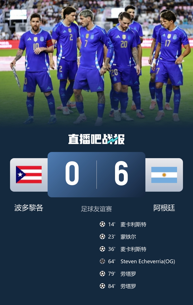 阿根廷友谊赛以6-0战胜波多黎各 梅西贡献2次助攻 麦卡利斯特和劳塔罗各进两球_足球直播在线直播观看免费