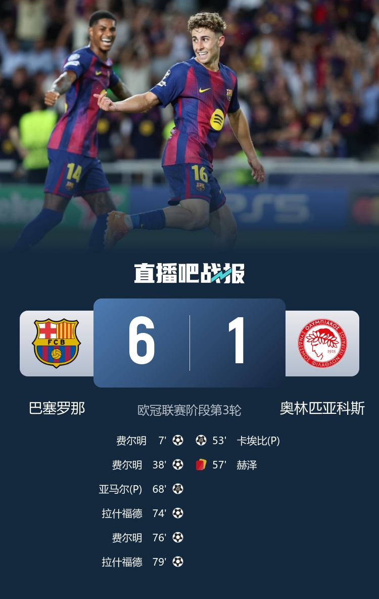 巴萨六球横扫十人奥林匹亚科斯 费尔明帽子戏法拉什福德双响赫泽红牌引发热议_欧冠免费在线