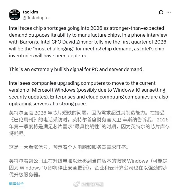 英特尔CPU库存堪忧 预计2026年第一季将耗尽 计划提价以平衡供需之道_体育直播