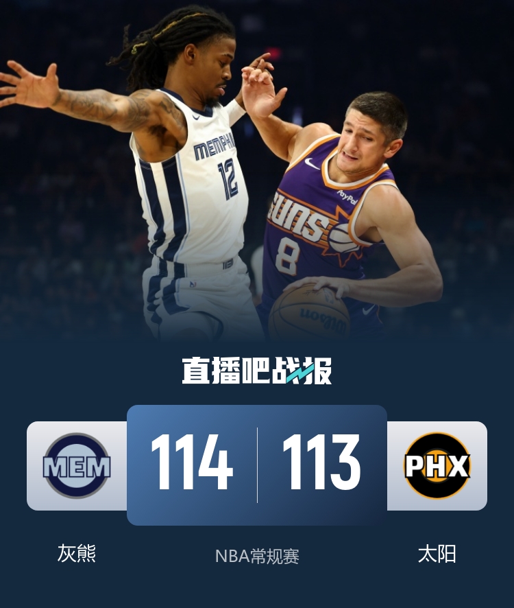 进入最后一节,比赛进入了白热化阶段。双方展开了激烈的攻防战,马威的一记暴扣帮助太阳队反超比分。然而,莫兰特在关键时刻又展现出了他的大心脏,一记跳投将比分再度拉回到了灰熊的阵营。尽管布克试图通过超远三分追分,却未能成功。最终,灰熊以114-113的小分差险胜,送给太阳四连败的尴尬。