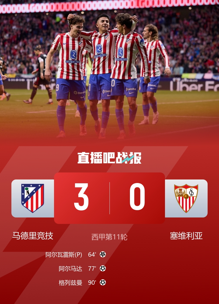 西甲赛场上演马竞大胜塞维利亚 阿尔瓦雷斯点球在握格列兹曼火力全开_西甲直播