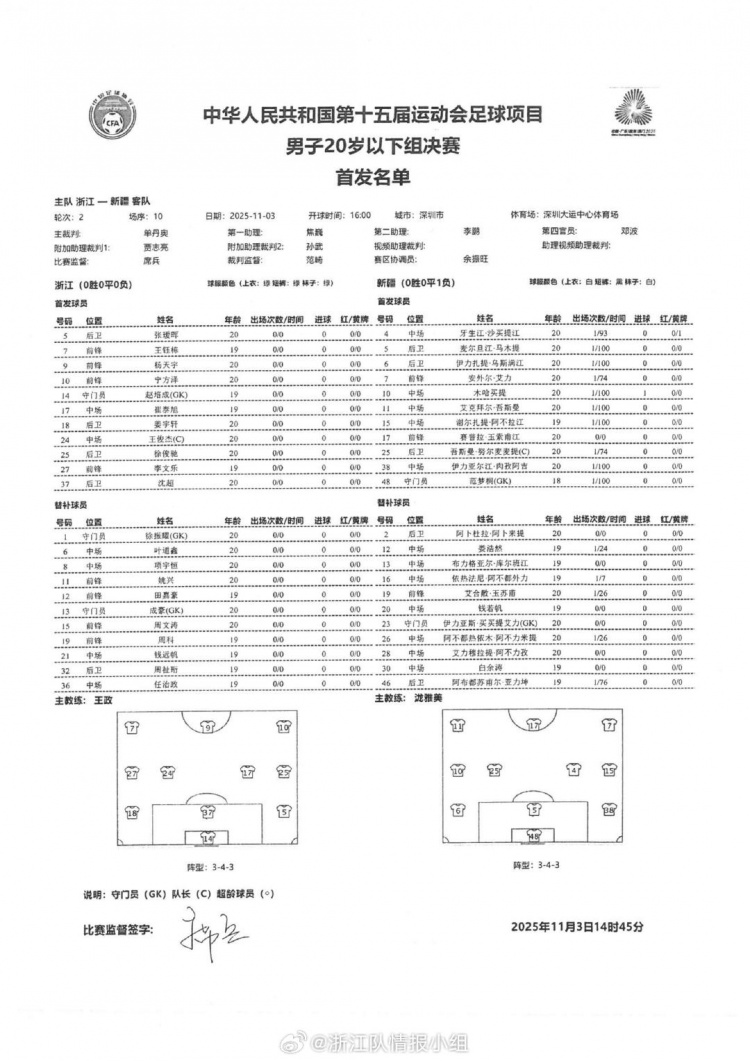 全运会男足U20浙江队和新疆队首发阵容曝光 王钰栋 张瑷晖 宁方泽联手出击_中超直播免费直播视频直播