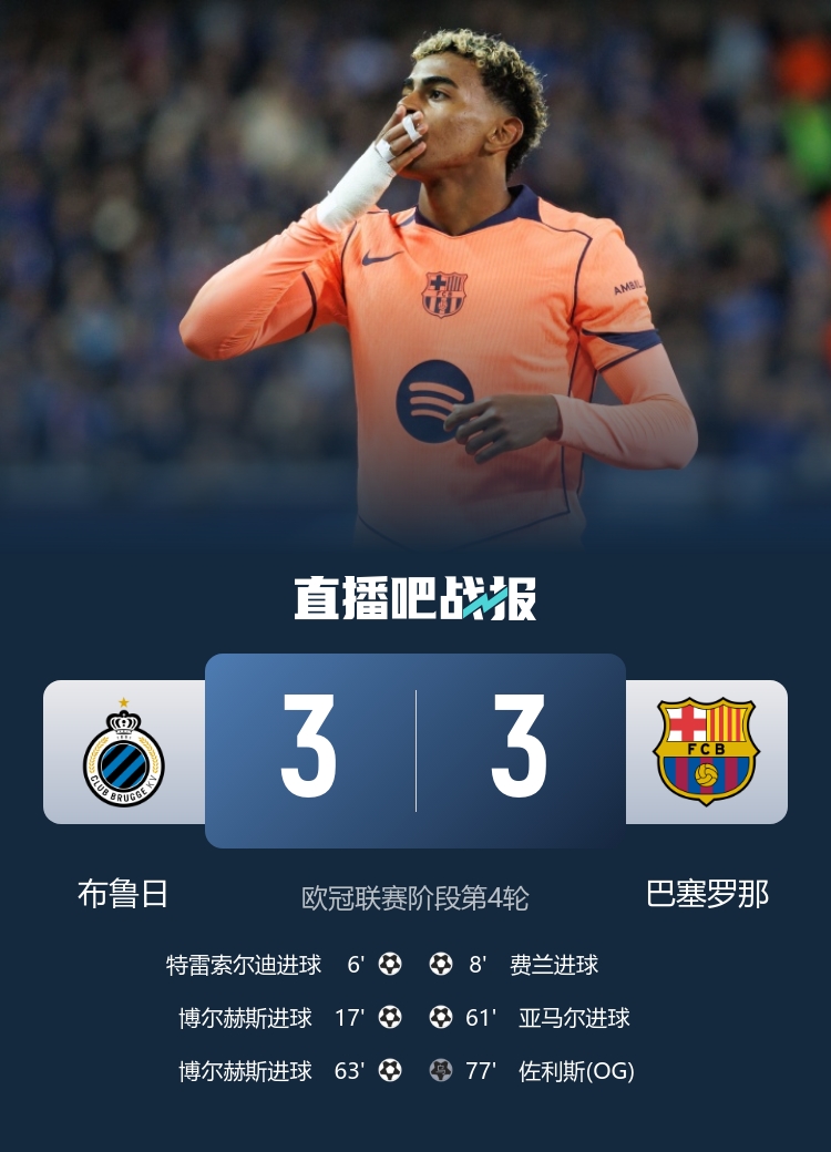 巴萨三度落后终平局 布鲁日激战落幕费尔明助攻亚马尔闪耀全场_欧冠直播在线直播观看