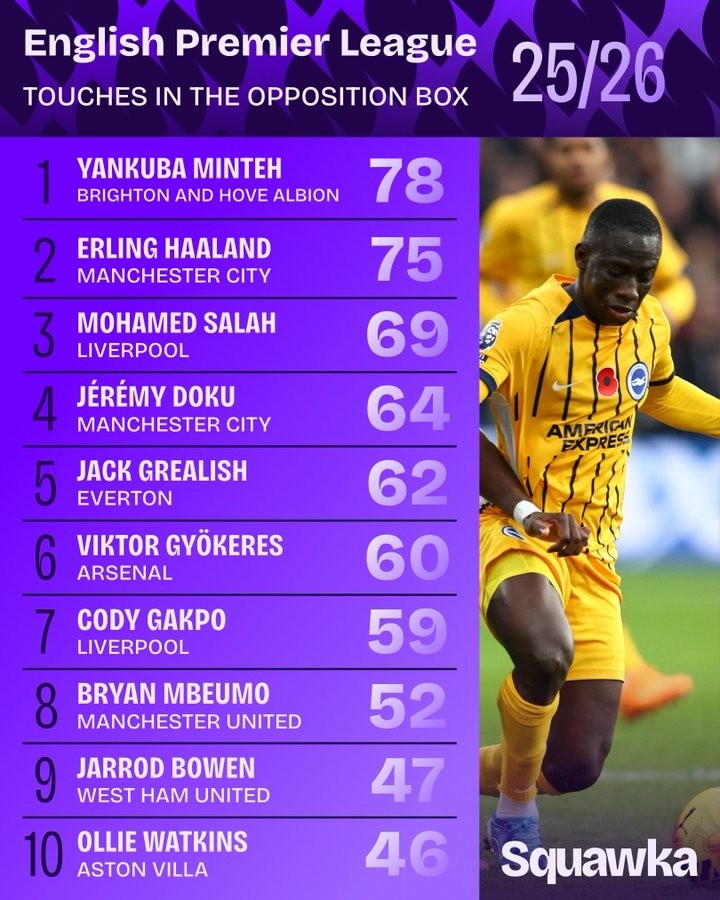 截至11月11日,英超联赛已经进行了11轮,近期Squawka统计了本赛季各球员在对方禁区内的触球次数,结果显示布莱顿的扬库巴·明特表现抢眼,以78次的触球次数高居榜首。这一数据不仅展现了明特在战术体系中的重要性,也体现了他在进攻方面的积极投入。