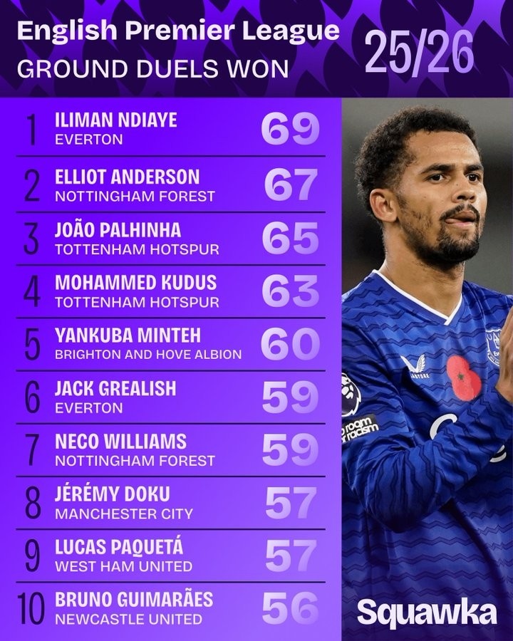 本赛季英超地面成功对抗排行榜:恩迪亚耶位居第一,多库和格拉利什紧随其后_英超直播