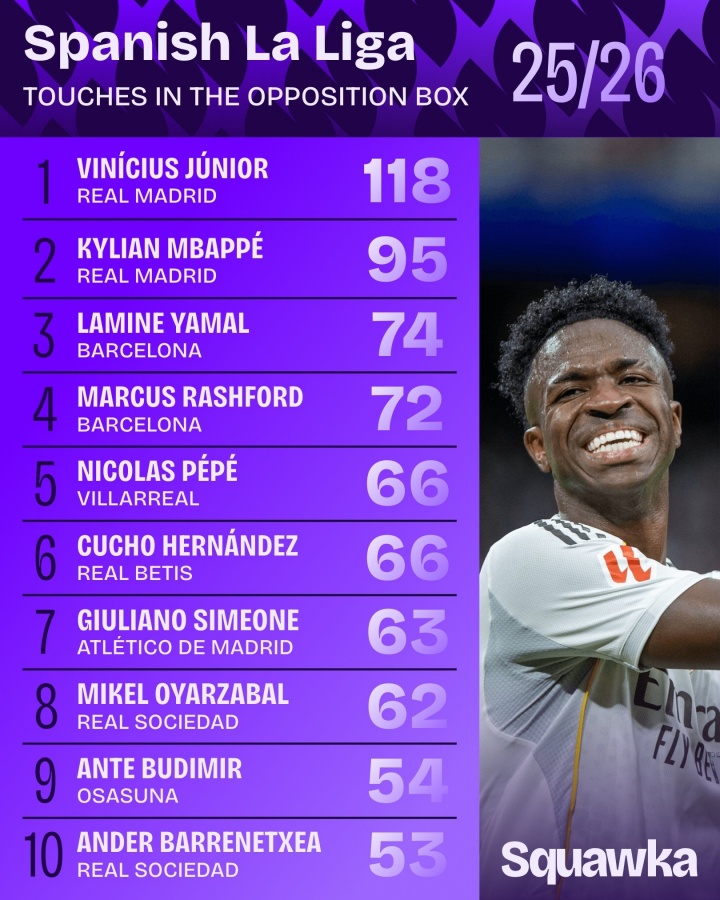 本赛季西甲禁区内触球排行榜新鲜出炉:维尼修斯领先,姆巴佩紧随其后_西甲直播