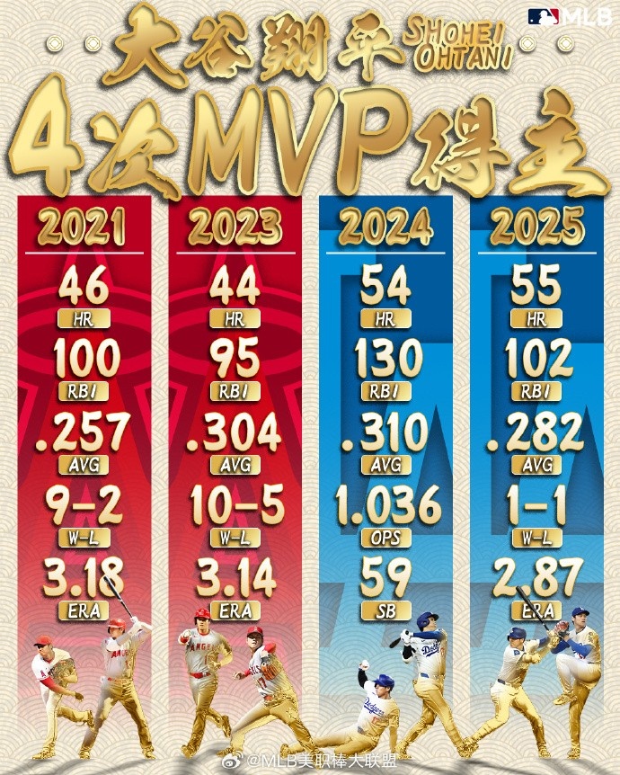 到了2025赛季,虽然打击数据略有回落,但55个本垒打和102个打点的成绩依然让人瞠目结舌。只不过他的胜投和败投却是各一,ERA降至2.87,不知道这是否说明他既是打者也是投手的“双面间谍”。