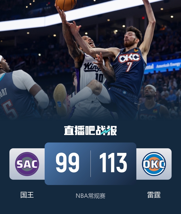 易边再战,切特的一记三分球像火箭般升空,将比分差距拉大到双位数。之后,两队就开始上演“谁更能抗”的拉锯战,亚历山大不断施加压力,国王的将士们则拼死追赶,努力演绎着“我还不放弃”的戏码。然而,末节多特突然像无限药水般激活,内外开花,连续得分让雷霆保持了优势。国王显然早已无力回天,最后的惨痛结局落幕,雷霆以113-99轻松击败国王,主场如愿过关。