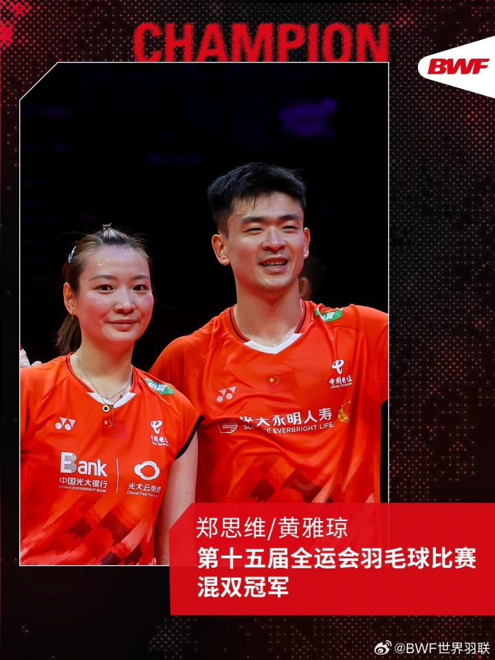 在11月20日进行的全运会羽毛球混双决赛中,郑思维与黄雅琼组成的雅思组合来自浙江,与湖南的周志宏和魏雅欣展开对决。经过两局较量,雅思组合以2-0的比分完胜,成功夺冠,并为自己的职业生涯画上了圆满的句号。