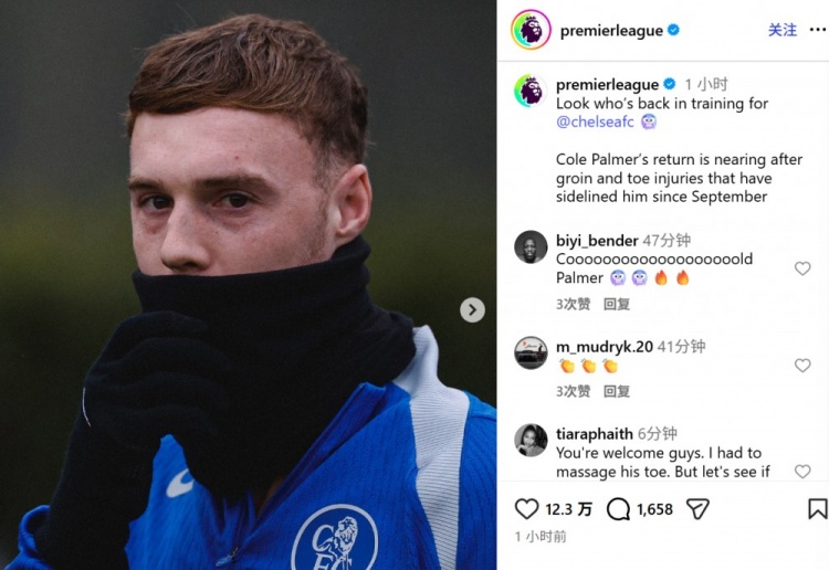 切尔西近期在训练场上的动态引起了广泛关注,特别是受伤的球员帕尔默的回归。英超官方社交媒体今天发布了切尔西的训练照片,显示帕尔默已经恢复训练,这对球队的士气无疑是个好消息。