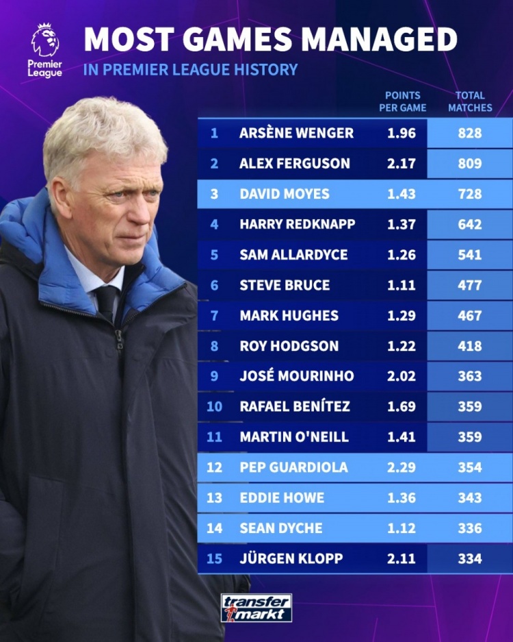 英超主帅执教场次排行榜:莫耶斯以728场位列第三,有望赶超弗爵爷与温格_英超直播