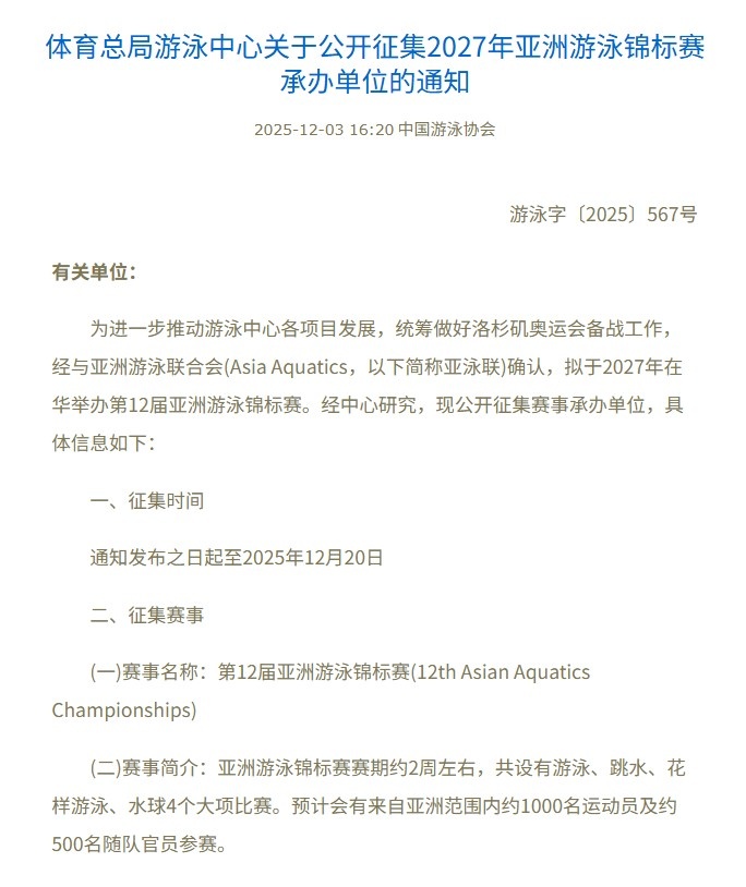 公告还明确了征集对象,包括各省市区县体育行政部门及其下属单位、地方游泳协会、具备独立法人资格且能承担民事责任的公司,以及其他符合赛事承办条件的单位。