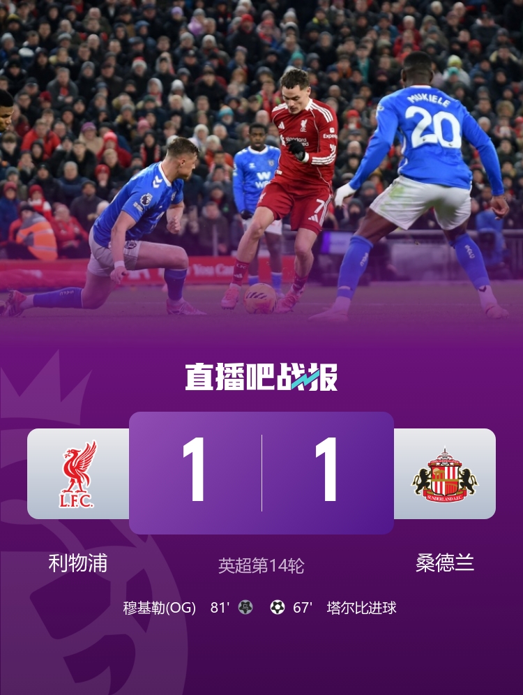 2025-26赛季英超联赛第14轮的较量在安菲尔德球场展开,利物浦主场迎战桑德兰。比赛于北京时间12月4日凌晨4:15开始。上半场两队未能打开局面,尽管利物浦的麦卡利斯特和桑德兰的休姆都有精彩的远射,但均未能取得进球。