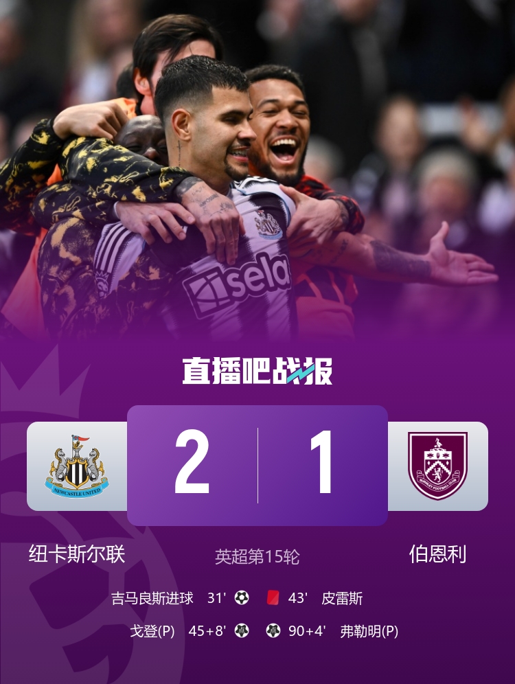 纽卡连续四场不败以2-1战胜十人伯恩利 吉马良斯角球破门伊兰加制造红牌_英超直播免费
