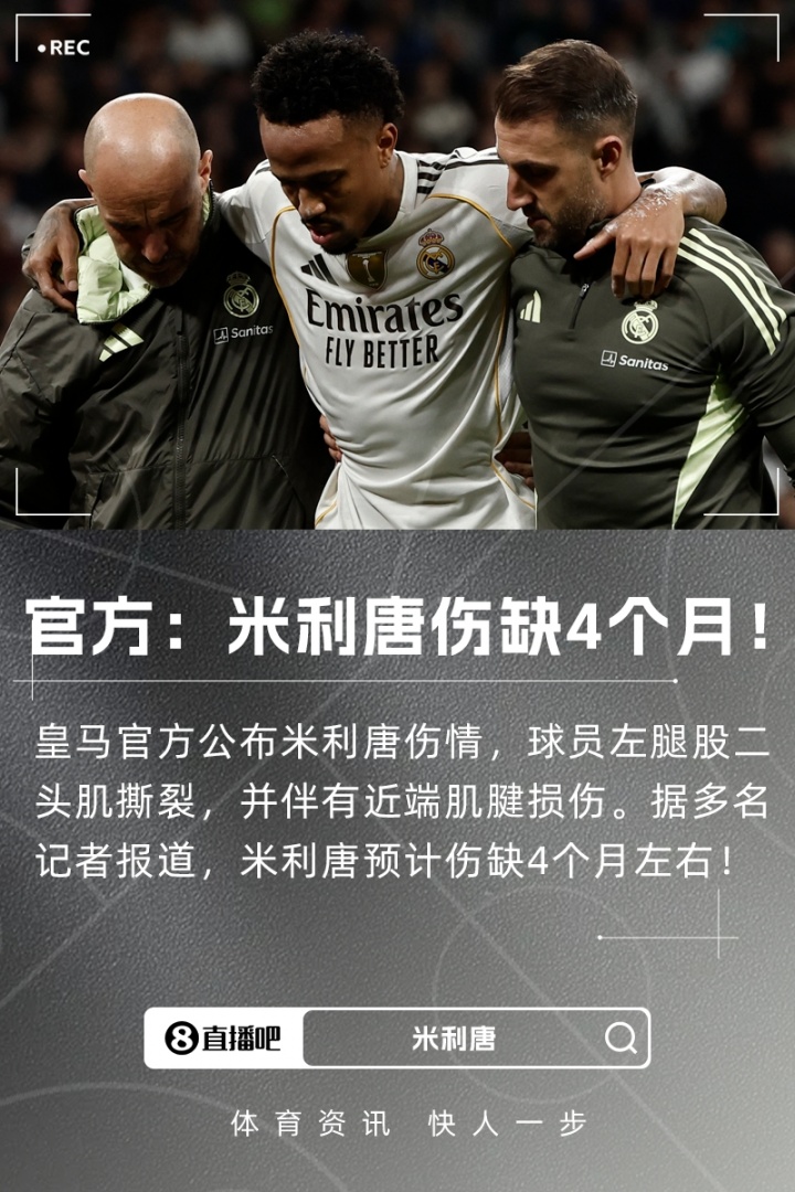 皇家马德里在本轮西甲赛场上遭遇了重创,球队官方宣布后卫米利唐的伤情。经医疗团队的详细检查,米利唐被诊断为左腿股二头肌撕裂,并伴有近端肌腱的损伤。根据记者Arancha Rodríguez的消息,米利唐预计将缺席约四个月的比赛,这对球队来说无疑是一次沉重的打击。