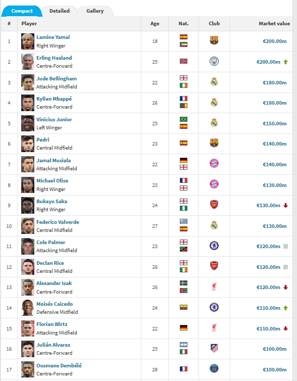 在这一队伍中,曼城的哈兰德独占鳌头,他的身价已高达2亿欧元,成为了这一份榜单的绝对王者。而阿森纳的两位年轻才俊,萨卡与赖斯,分别以1.3亿和1.2亿的身价,彰显了他们的巨大潜力和未来商机。利物浦则也有上佳表现,伊萨克与维尔茨的身价均达到1.2亿和1.1亿,显示了这支球队在市场中的强劲实力。