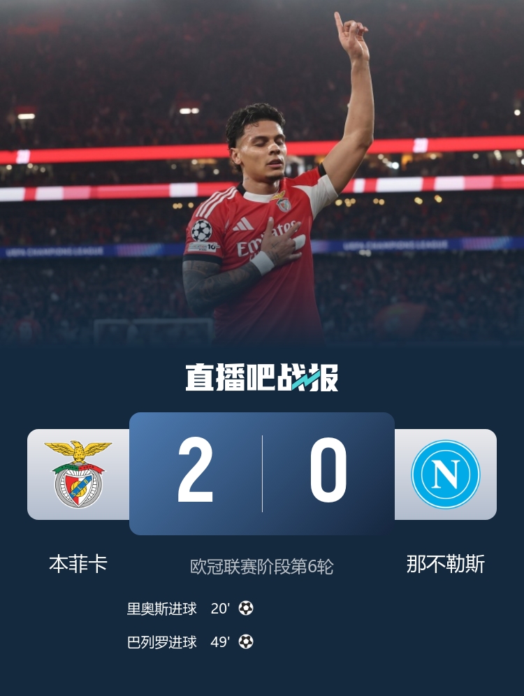穆里尼奥战胜孔蒂 本菲卡以二比零击败那不勒斯 里奥斯传射 巴列罗脚后跟破门精彩无比_欧冠直播