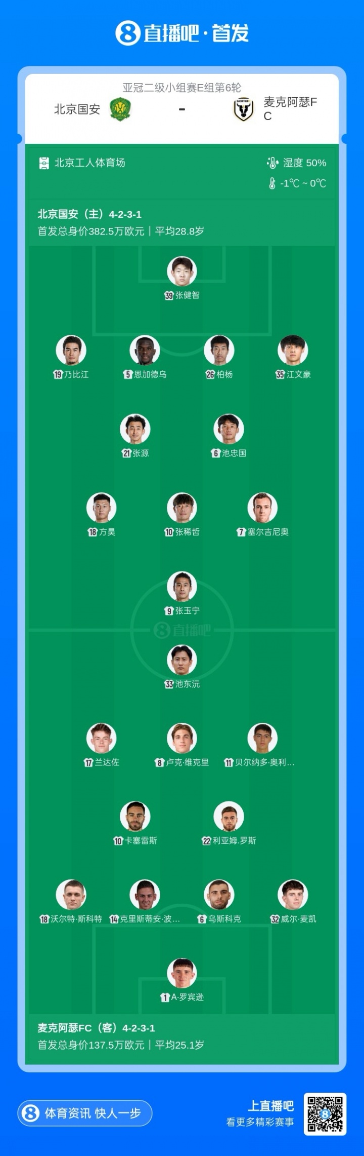北京时间今晚20:15,亚冠二级小组赛E组第六轮的比赛将展开,北京国安将在主场迎战来自澳大利亚的麦克阿瑟FC。赛前,双方的首发阵容已经确认。