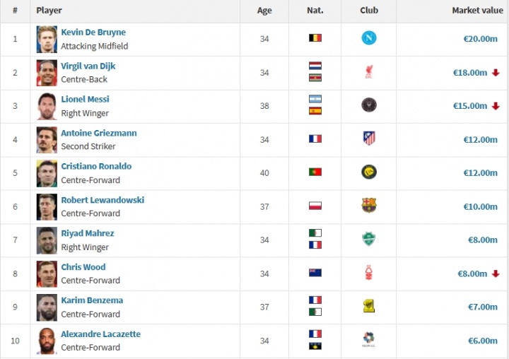 榜单中,排名第一的是比利时的德布劳内,他的身价达到2000万欧元,效力于那不勒斯。紧随其后的是荷兰后卫范戴克,身价为1800万欧元,现为利物浦的中流砥柱。