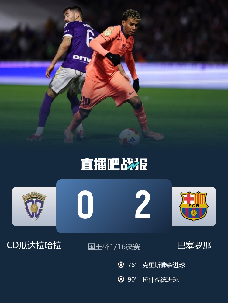 12月17日凌晨4:30,西班牙国王杯1/16决赛中,巴萨在佩德罗埃斯卡廷体育场迎战西协甲球队瓜达拉哈拉。整场比赛上半场双方都未能攻破对方球门;进入下半场后,拉什福德未能把握住单刀机会,但德容的精妙助攻帮助克里斯滕森打入首球。比赛临近结束时,亚马尔再次展现出卓越的能力,助攻拉什福德锁定胜局,最终巴萨以2-0战胜瓜达拉哈拉,顺利晋级国王杯16强。