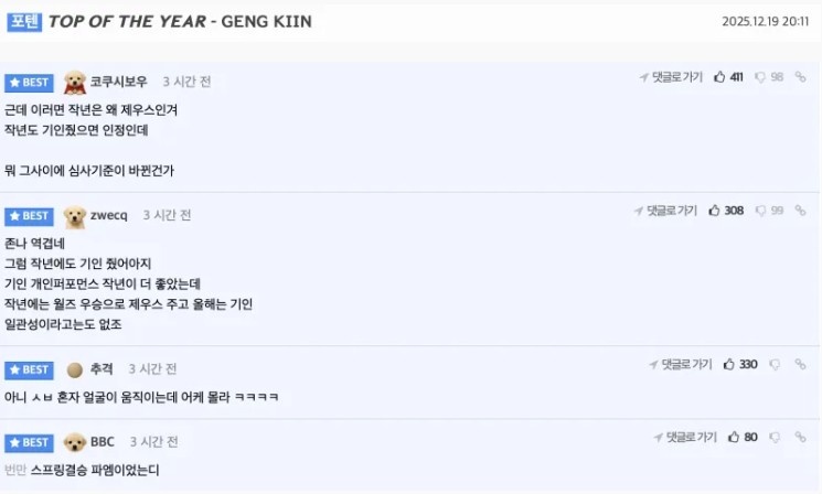 在讨论中,有人提到2024年的Zeus和2025年的Doran,他们的成就被视作与奖励不成正比。虽然去年Kiin表现突出,但最终未能获奖。许多网友认为评选更加偏向于世界赛的表现,而忽视了其他赛事。