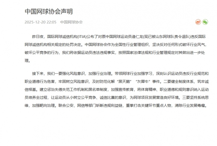 声明指出,作为全国性行业管理组织,中国网球协会坚决反对任何有损网球行业形象和破坏公平竞争的行为。同时,协会强调将依据逄仁龙的违法违规事实,依据国家法律法规及行业管理规定,对其实施进一步的处理。