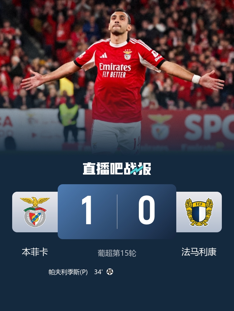 本菲卡在各項賽事中收獲四連勝以1比0戰勝法馬利康,保持15輪不敗,帕夫利季斯的點球成關鍵