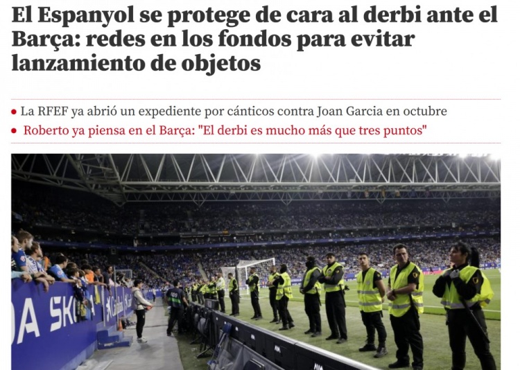 所以,为了做好防范措施,西班牙人下决心在主场球门后方装上防护网,仿佛他们认为,球迷向场内投掷杂物就能将球队的负能量“打回去”。即使是内部安全措施也无法掩盖这场诸多不安的德比战即将来临的严峻形势。