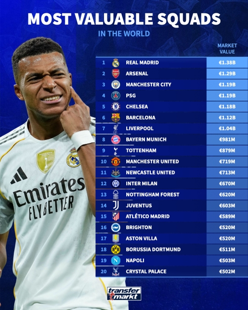 位列第二的是英超豪门阿森纳,身价达到12.9亿欧元,标志着球队在加强阵容上的成功策略。紧随其后的是曼城和巴黎圣日耳曼,两支球队都以11.9亿欧元并列第三和第四,毫无疑问都是实力强劲的存在。