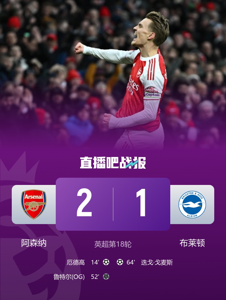 阿森纳再创佳绩 2-1战胜布莱顿 厄德高破蛋赖斯助攻乌龙加布回归_英超直播