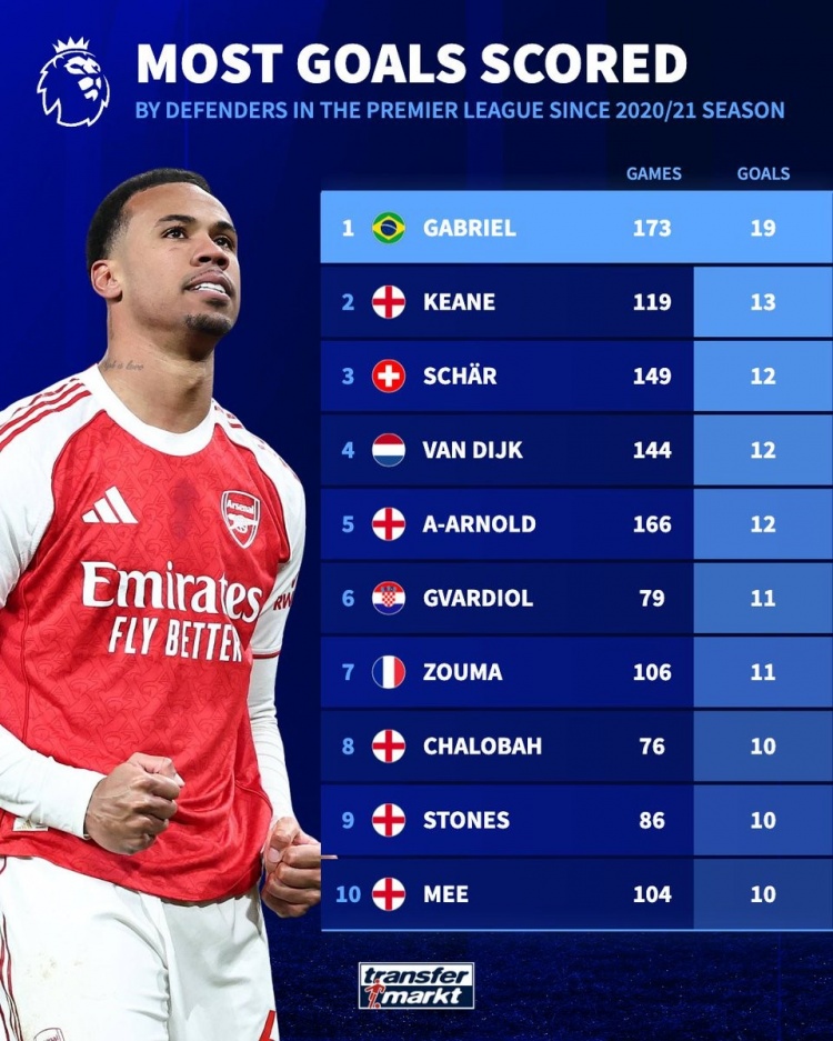 截至12月31日,依据《转会市场》的统计,自2020-2021赛季以来,英超联赛后卫的进球表现中,阿森纳的中卫加布里埃尔以其突出的表现位居榜首。数据显示,他在173场比赛中打入了19球,显示了他在攻击端的威胁。