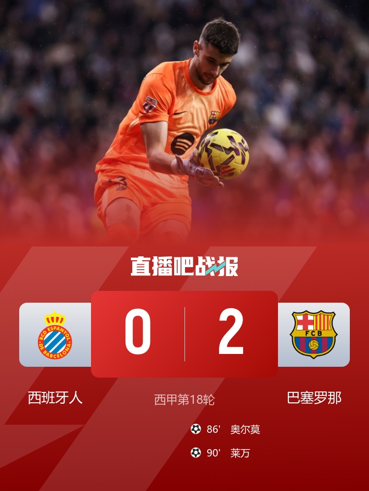 巴萨迎来八连胜以2-0战胜西班牙人暂时领先7分 奥尔莫和莱万进球霍安表现出色_西甲直播