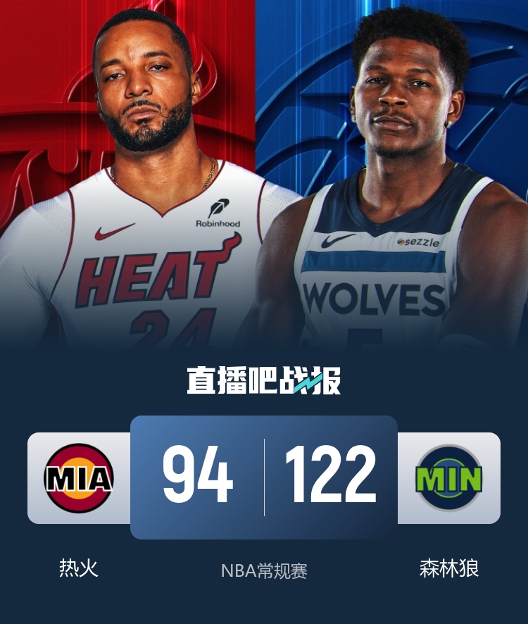森林狼以28分优势战胜热火 爱德华兹贡献26分 戈贝尔得到13分和17个篮板 鲍威尔拿下21分_NBA直播