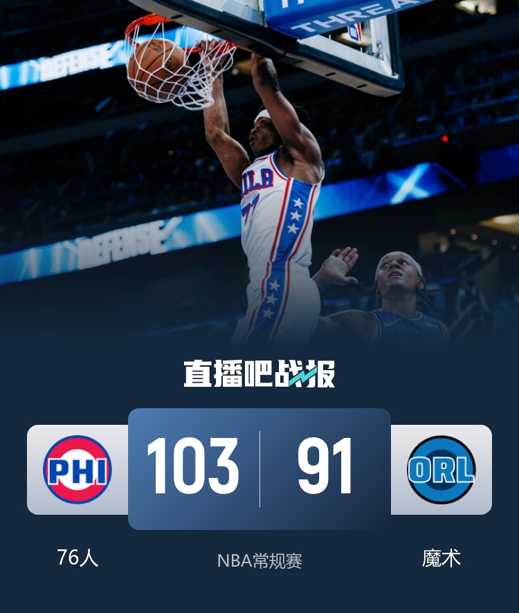 76人击败魔术 马克西大放异彩斩获29分 恩比德贡献22分9篮板 贝恩鞭策球队收获23分5助攻5篮板_NBA直播