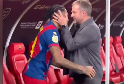当终场哨声响起时,队友们兴高采烈地庆祝这场来之不易的胜利,而拉菲尼亚则在场边跪下,目光投向替补席。在比赛进行到第83分钟时,他被拉什福德替换下。此时,弗里克走向他,给予了他一个富有情感的拥抱。这个瞬间展现了彼此间深刻的相互理解,这种理解建立在信任和感谢的基础之上,也反映了本赛季早已形成的默契。