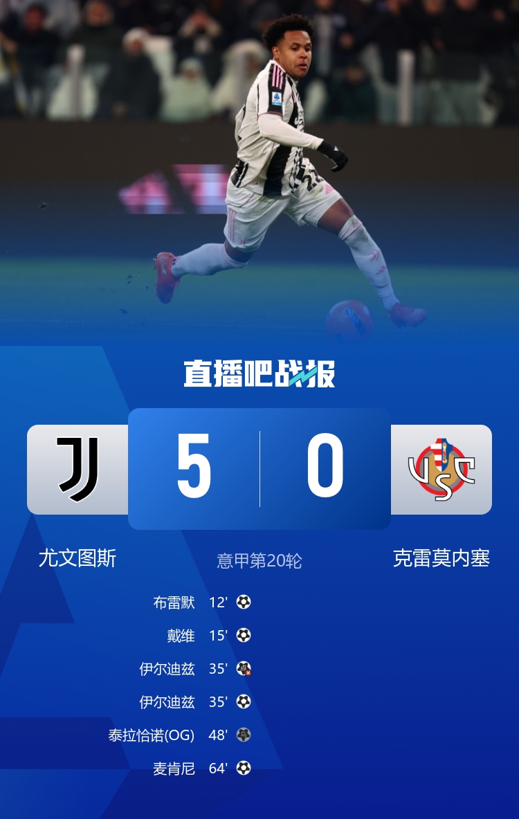 意甲比赛尤文图斯以五比零战胜克雷莫内塞 伊尔迪兹和戴维进球 麦肯尼助攻对方乌龙并打入一球_意甲直播