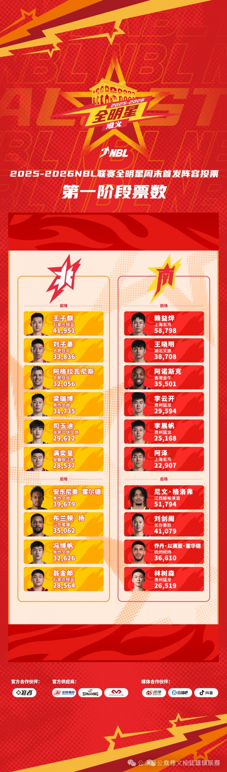 2025-2026赛季NBL联赛全明星周末首发阵容的第一阶段投票结果已经公布。我们非常高兴地看到,焦作文旅的三位杰出球员在北区的投票中取得了优异的成绩,实力得到了全网球迷的广泛认可和支持!