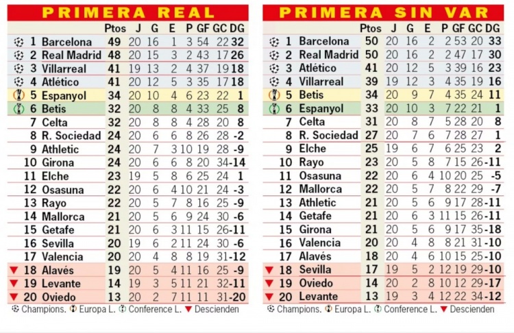 阿斯报天真的“假设如果没有VAR”西甲积分榜:巴萨多了1分皇马多了2分_西甲直播