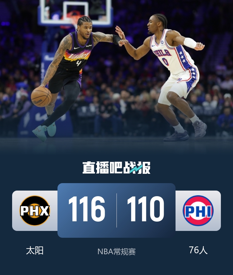 在1月21日的NBA常规赛中,菲尼克斯太阳队在客场以116-110击败了费城76人队。此役,太阳队的战绩改为26胜17负,排名西部第7,而76人则以23胜18负位列东部第5。其中,两队的核心球员乔治和恩比德均因伤缺阵,给双方的阵容带来了不小的影响。