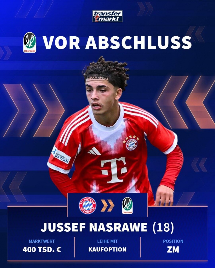 1月23日讯,据Sport.de的消息,拜仁慕尼黑的18岁中场小将尤瑟夫·纳斯拉维即将外租加盟奥地利甲级联赛的列特队。这种租借的安排已与列特达成协议,租借协议中还包含可激活的买断条款,不过具体的金额暂时未披露。