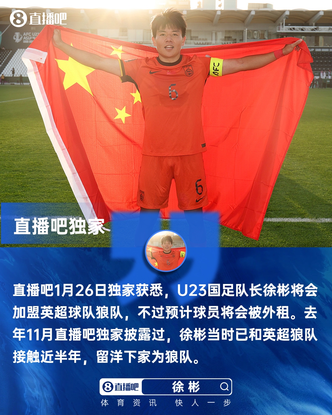据独家消息,U23国足队长徐彬即将加盟英超球队狼队,预计他在加盟后会被外租。早在去年的11月,便有消息透露徐彬与狼队的接触已持续近半年,留洋之路以这支英超球队为目标。