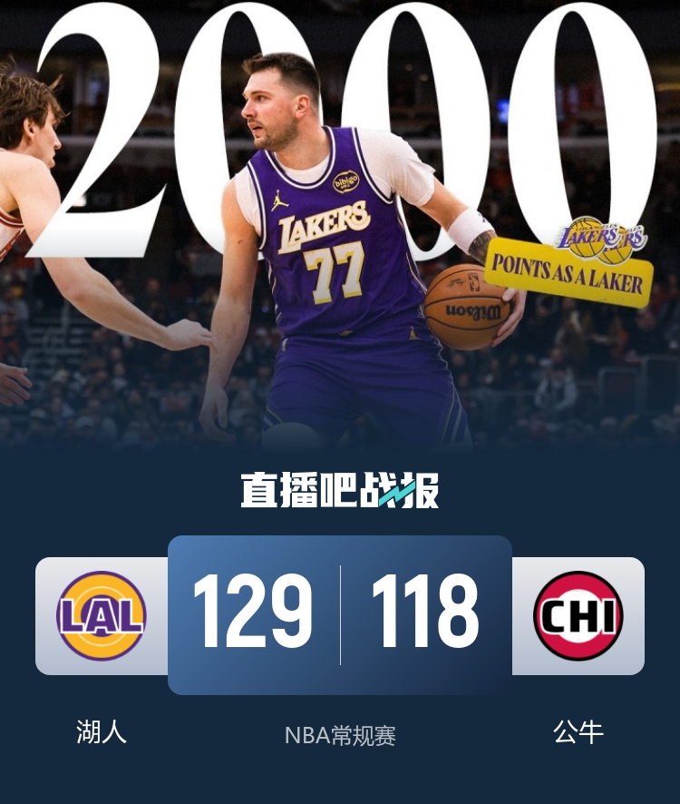 下半场开始,公牛继续追分,曾将分差缩小至1分,但东契奇此节状态火热,单节轰下20分,有效帮助湖人稳住局势,三节结束时湖人以104-89领先。进入最后一节,湖人稳扎稳打,保持优势,分差在10分左右波动,而公牛未能缩小差距。湖人最终以129-118战胜公牛,赢得了这场比赛的胜利。