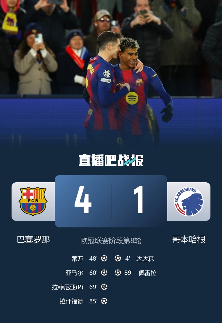 巴萨逆转哥本哈根轻松晋级16强 亚马尔身怀绝技莱万破门拉菲尼亚点球完美收官_欧冠直播