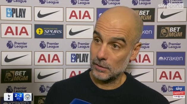 在英超第24轮的一场精彩对决中,热刺与曼城以2-2的比分握手言和。比赛中,热刺的第一个进球引发了不少讨论和争议。赛后,曼城的主教练瓜迪奥拉在接受天空体育采访时被问及这个进球时表现得相当谨慎。