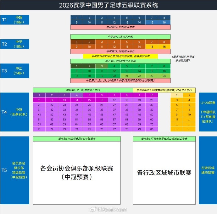 与此同时,在中乙的竞争中,排名前两位的球队将向中甲发起冲击,而第3名的球队将与中甲的第14名展开附加赛争夺名额。值得注意的是,当B队有希望争取升级时,通常最多只有一支队伍能够实现升迁或参与附加赛。如果排名在底部的球队未能表现出色,第21到第24名的球队将被迫降入中冠联赛。有趣的是,如果B队也降级,那么它们将失去资格,直接降入U-20联赛。