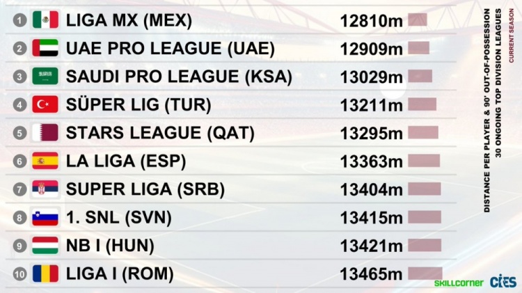 首先是墨西哥超级联赛,球员在无球状态下平均每90分钟的跑动距离为12810米,显示出该联赛球员在防守方面的相对放松。接下来是阿联酋职业联赛,平均跑动距离为12909米,显示出类似的趋势。