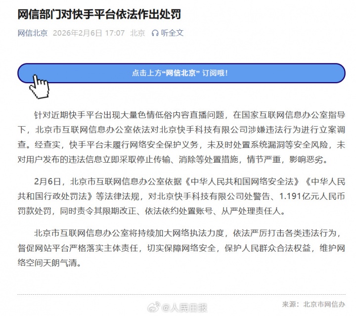 快手平臺因違規行為被網信部門依法處罰,面臨警告並繳納1.191億元罰款